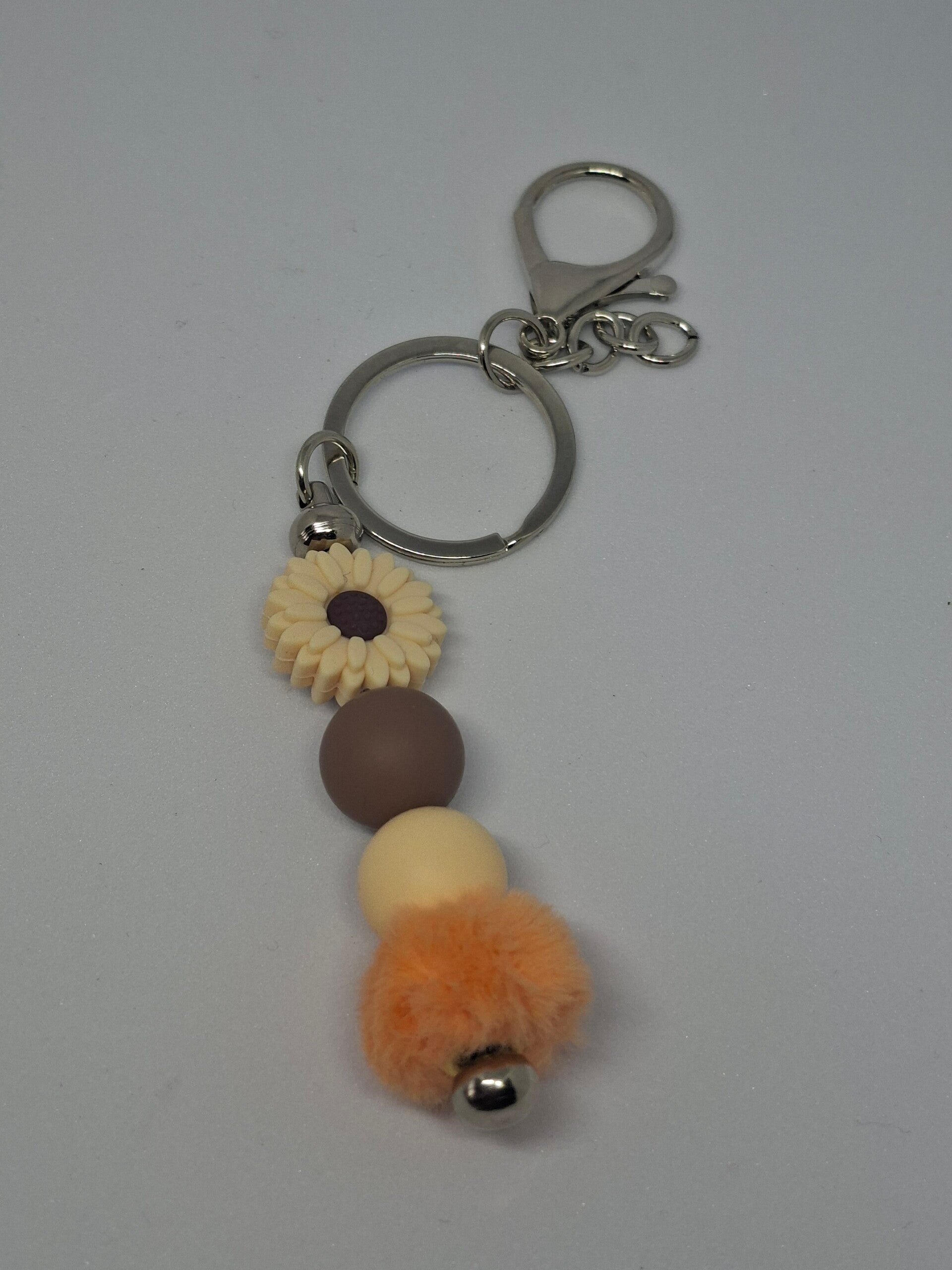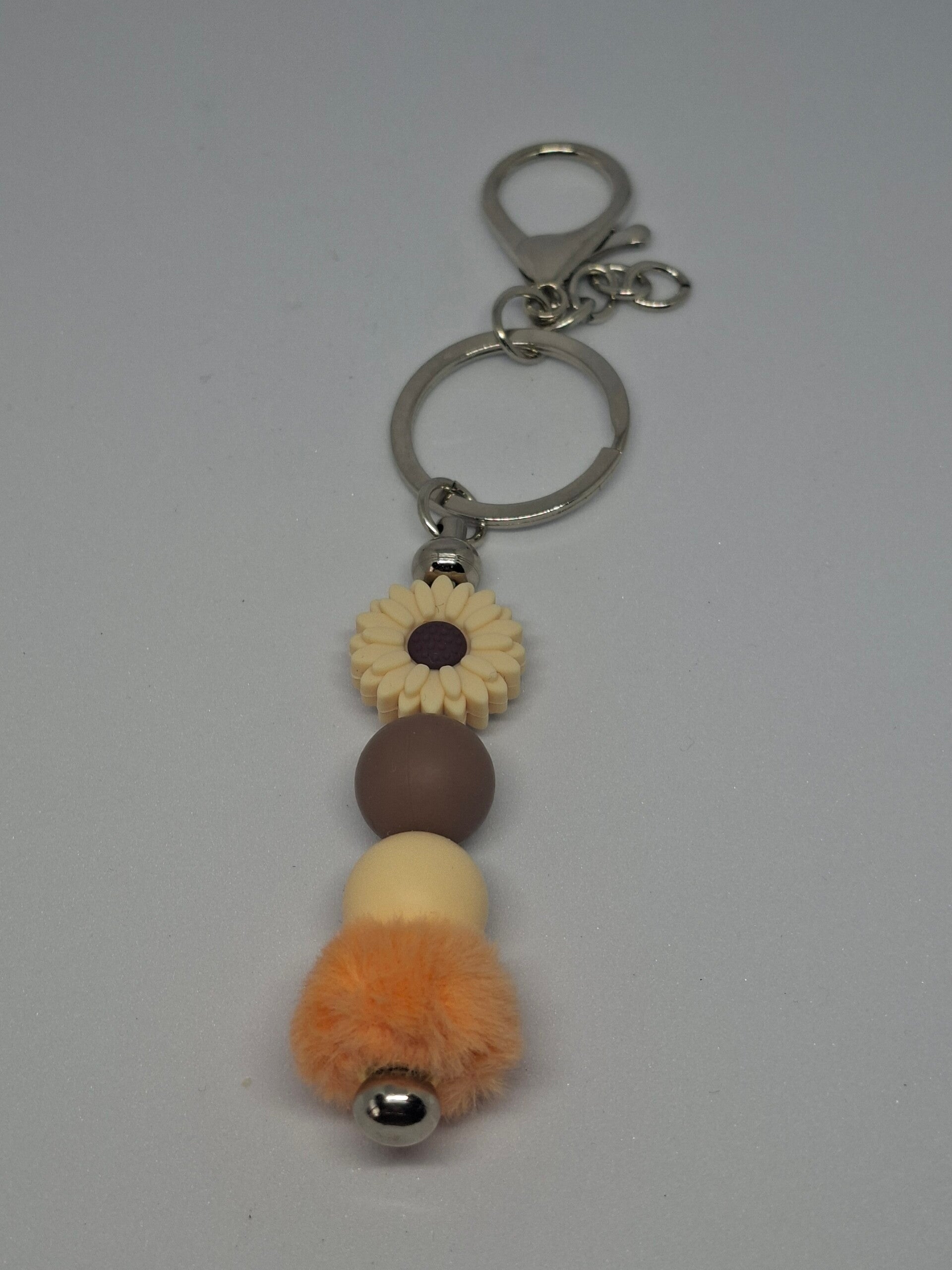 Deze sleutelhanger heeft siliconen kralen in verschillende kleuren, een madeliefje en een oranje pluizige kraal. De hanger is van RVS.